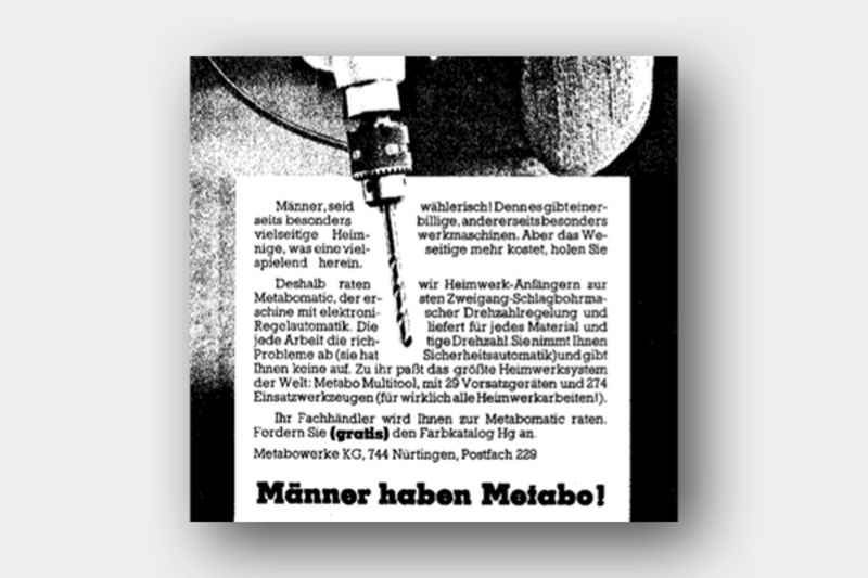 Toda duh časa se spreminja. V 80. letih prejšnjega stoletja Metabo jasno ugotavlja, da ženske moti ta trditev - in da želijo, da jih kot uporabnice jemljejo resno. Slogan "Moški imajo Metabo" postane zgodovina. Orodja Metabo pomenijo kakovost, zmogljivost in varnost - tako za moške kot ženske. Dobrodošli v podjetju Metabo, kjer lahko vsakdo najde orodje, ki ustreza njegovim potrebam.